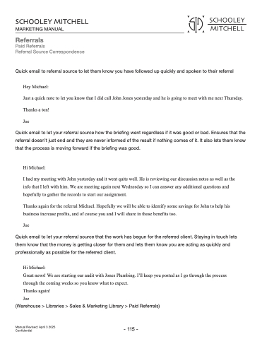 Quick email to let your referral source that the work has begun for the referred client. Staying in touch lets them know that the money is getting closer for them and lets them know you are acting as quickly and professionally as possible for the referred client.