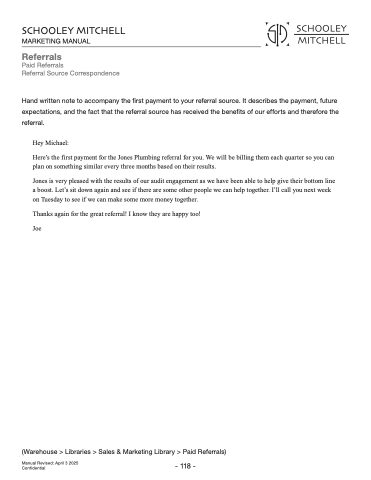 Hand written note to accompany the first payment to your referral source. It describes the payment, future expectations, and the fact that the referral source has received the benefits of our efforts and therefore the referral.