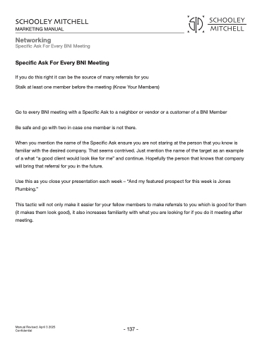 Go to every BNI meeting with a Specific Ask to a neighbor or vendor or a customer of a BNI Member Be safe and go with two in case one member is not there.