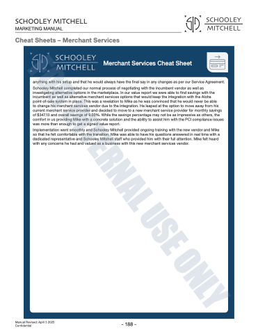to change his merchant services vendor due to the integration. He leaped at the option to move away from his current merchant service provider and decided to move to a new merchant service provider for monthly savings of $347.13 and overall savings of 9.00%. While the savings percentage may not be as impressive as others, the comfort in us providing Mike with a concrete solution and the ability to assist him with the PCI compliance issues was more than enough to get a signed value report.