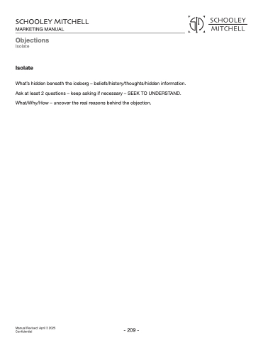 What’s hidden beneath the iceberg – beliefs/history/thoughts/hidden information. Ask at least 2 questions – keep asking if necessary – SEEK TO UNDERSTAND. What/Why/How – uncover the real reasons behind the objection.