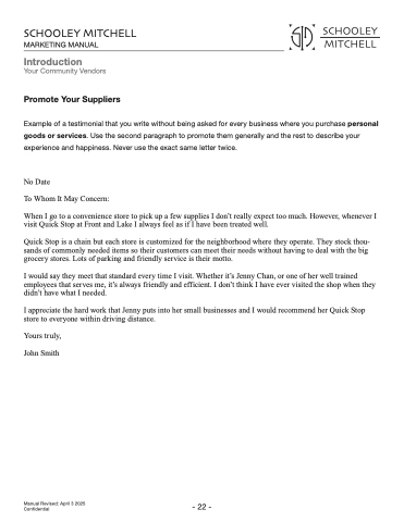 Example of a testimonial that you write without being asked for every business where you purchase personal goods or services. Use the second paragraph to promote them generally and the rest to describe your experience and happiness. Never use the exact same letter twice.