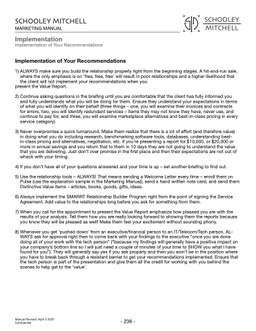 3) Never overpromise a quick turnaround. Make them realize that there is a lot of effort (and therefore value) in doing what you do including research, benchmarking software tools, databases, understanding best- in-class pricing and alternatives, negotiation, etc. If you’re presenting a report for $10,000, or $20,000 or more in annual savings and you return that to them in 10 days they are not going to understand the value that you are delivering. Just don’t over promise in the first place and then their expectations are not out of whack with your timing.
