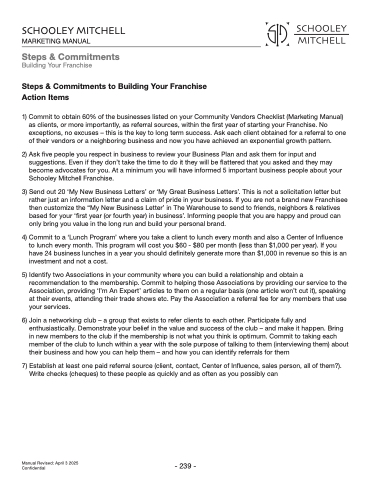 1) Commit to obtain 60% of the businesses listed on your Community Vendors Checklist (Marketing Manual) as clients, or more importantly, as referral sources, within the first year of starting your Franchise. No exceptions, no excuses – this is the key to long term success. Ask each client obtained for a referral to one of their vendors or a neighboring business and now you have achieved an exponential growth pattern.