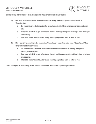 6) BNI – send the email from the Marketing Manual every week that asks for a ‘Specific Ask’ to a different member each week.