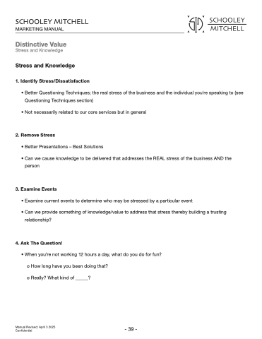 • Better Questioning Techniques; the real stress of the business and the individual you're speaking to (see Questioning Techniques section)