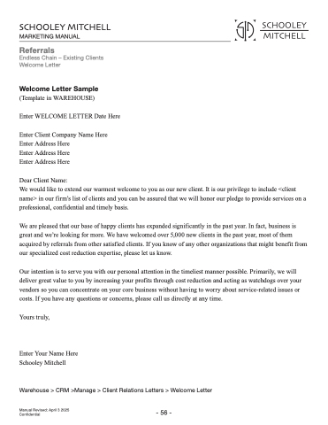 Warehouse > CRM >Manage > Client Relations Letters > Welcome Letter