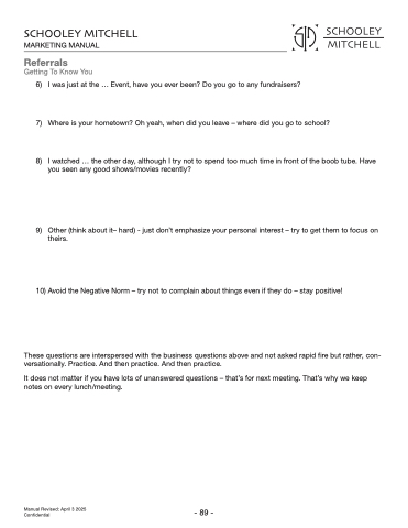 These questions are interspersed with the business questions above and not asked rapid fire but rather, con- versationally. Practice. And then practice. And then practice.